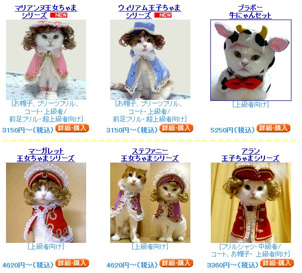 Thankfully they've included pictures of cats modeling every outfit, so you can get a preview of the sad tortured look you'll be getting from your pet.