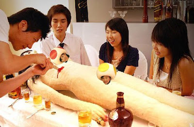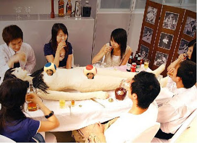 Apparently there's a restaurant in Japan that serves up full sized recreations of dead bodies. The entire body is edible; if you're in the mood for internal organs, you can cut them out and the body will actually bleed. I guess I can't really judge Japan on this one, it's sort of like the pinatas that we have at children's parties. This is just a super realistic, bleeding, meat pinata... perfectly normal.