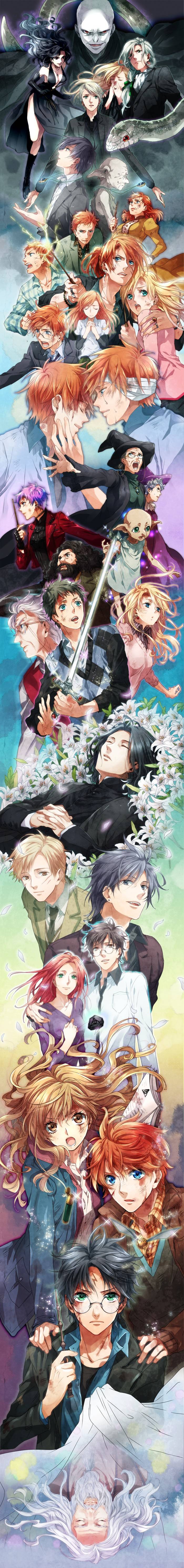 from top to bottom : Voldemort Bellatrix Lestrange Lucius and Narcissa Malfoy Draco Malfoy, Nagini Regulus Black, Kreacher Molly, Arthur Weasley, Charlie,Bill and Fleur Weasley Percy, Ginny, the twins Fred and George Weasley Minerva McGonaggall, Pomona Sprout, Nymphadora Tonks, Rubeus Hagrid, Dobby (not sure but looks like Xenophilius Lovegood) Neville Longbottom, Luna Lovegood Severus Snape (dead in a bed of Lilies) Remus Lupin, Sirius Black Lily and James Potter the Trio, Albus Dumbledore hehe....im an addict thank God i found this one